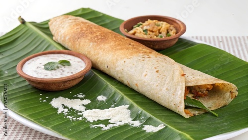 Savoring a delightful dosa rolled on a banana leaf accompanied by coconut chutney in a traditional indian setting