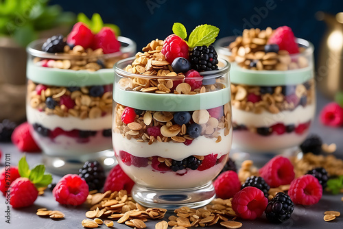 Savoring Health and Happiness: Delightful Fruit Parfait Infused with Vibrant Berries, Creamy Yogurt, Crunchy Granola, and Fresh Mint Leaves, A Guilt-Free Indulgence to N muesli with yogurt and berries