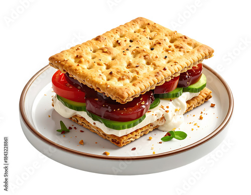 cracker, sandwich, tomatoes, cucumber, jelly, savoury, snack, food, meal, dish, cookery, delicious, epicure, fresh, healthy, vegetarian, ingredient, stack, layered, textured, seasoned, plate, basil, garnish, culinary, presentation, tasty, crunchy, crispy, baked, bread, filling, vegetable, fruit, dairy, creamy, lemony, sweet, vibrant, colourful, closeup, detail, nourishment, diet, gastronomy