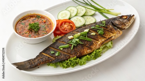 Savory Grilled Fish Platter: A meticulously composed shot of a delectable grilled fish, artfully arranged with fresh vegetables and flavorful sauce on a pristine white plate.