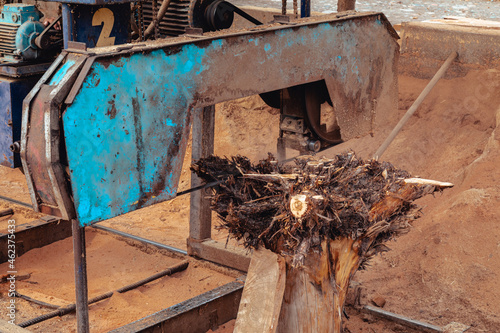 Sawing machine cutting tree log at wood production factory. Timber material processing and cutting at sawmill