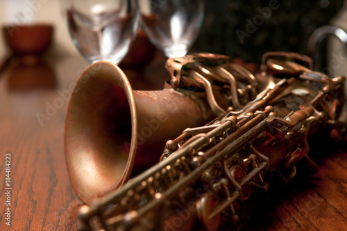 Saxophone and Glasses on a Bar
