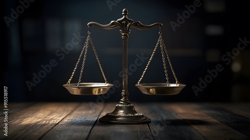 Scales of justice, antique brass balance, black background, dramatic lighting, legal concept, symmetry, golden metallic finish, wooden table surface, chiaroscuro effect.