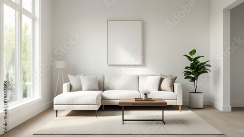 Scandinavian living room featuring a sectional sofa, wooden coffee table, and monochrome art, Scandinavian style, modern comfort