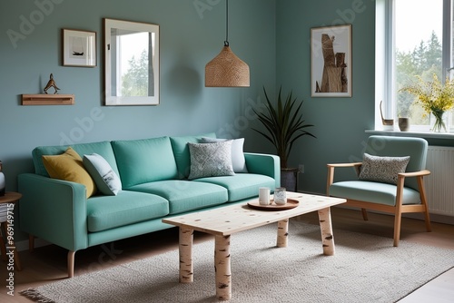 Scandinavian Style Retreat Displaying Mint Sofa Birch Coffee Table and Cozy Living Space