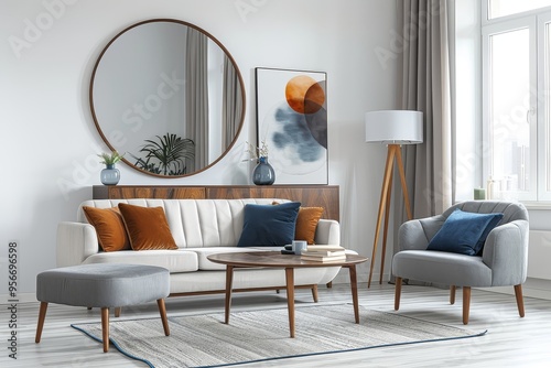 Scandinavian-style living room with white walls, featuring an elegant blue-gray and walnut wood sideboard, contemporary furniture, including a sofa, coffee table, dining chairs, floor lamp, mirror