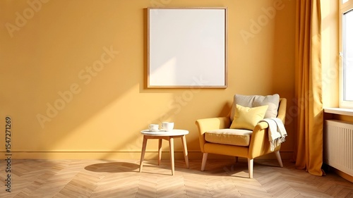 Scandy minimal interior with armchair, table, green plant and painting empty mock up