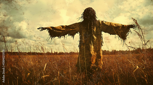 illustration, scarecrow, tattered, clothes, autumn, field, capturing, nostalgic, haunting, beauty, rural, farm, classic, style, tradition, mystery
