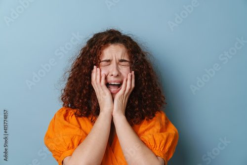 woman, people, girl, face, touching, screaming, unhappy, displeased, dislike, scared, frightened, stressed, young, caucasian, ginger, redhead, curly, isolated, blue, background, copy space