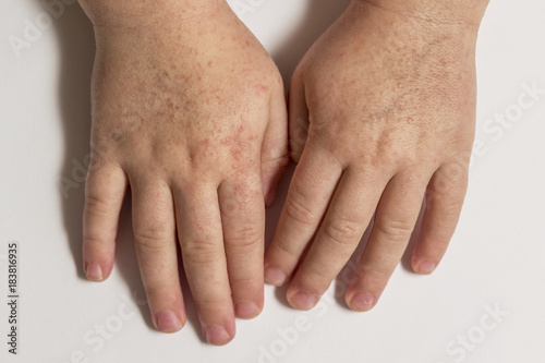 Scarlet fever. Two children's hands with rash on white background.