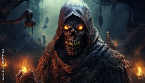 Scary Halloween scene with a dark creature, mystic objects and fantastic spiritual fabric background