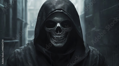 Scary portrait of horrifying Reaper with skeleton face, spooky dark black model and black hood, halloween and death related