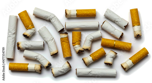 Scattered arrangement of used cigarette butts showing burnt filtered ends on clean white background