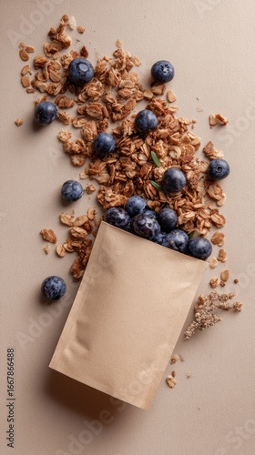 granola, blueberry, healthy, breakfast, snack, pouch, paper, food, organic, whole, grain, nut, seed, sweet, fresh, delicious, natural, fiber, alimentary, vegan, vegetarian, tasty, homemade, easy, convenient, dessert, topping, mix, scattered, open, pale, beige, background, light, top, view, flat, lay, arrangement, composition, closeup, food photography, simple