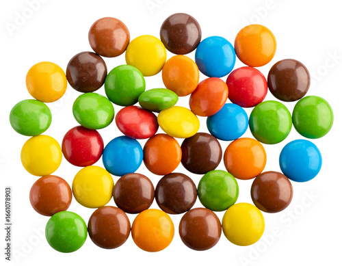 Scattered Multicolored Chocolate Buttons, Front View, isolated on transparent background.