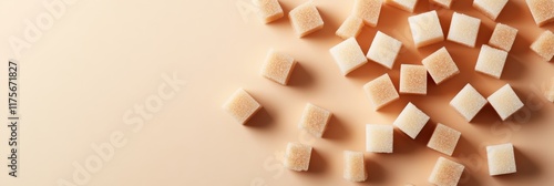 Scattered refined sugar cubes on neutral surface show impact of sugar on health and awareness of sugar reduction in diets