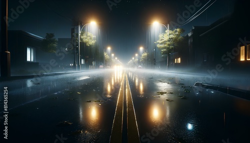 scene of a rainy night on a deserted street. The sky is dark with no stars or moon, reflecting the quiet and solitude of the night.