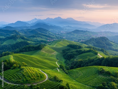 scenic, aerial, view, rolling, hill, countryside, landscape, nature, dusk, serene, peaceful, rural, green, panorama, horizon, calmness, farmland, lush, field, vale, picturesque, mountain, sunset, twilight, beauty, agricultural, vista, terrain, scenery, vegetation, meadow, sunlight, atmosphere, travel, exploration, journey, adventure, majestic, environment, idylli, calm, retreat