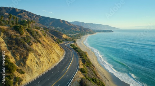 road, coast, ocean, mountain, landscape, nature, travel, scenery, wave, sky, horizon, curve, palm, tree, shore, sunlight, blue, water, sand, hill, vista, calmness, adventure, exploration, driving, summer, vacation, environment, beauty, peaceful, coastline, scenic, route, geography, terrain, elevation, natural, view, photo