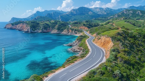 road, coastal, sea, ocean, mountain, landscape, scenic, view, travel, summer, blue, turquoise, green, hill, nature, coast, cliff, highway, asphalt, journey, vacation, picturesque, paradise, adventure, drive, route, way, path, curve, bend, horizon, sky, cloud, sun, bright, day, beautiful, amazing, stunning, aerial, drone, photo, image, photo, picture, background