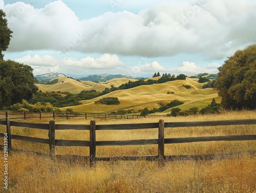 Scenic countryside with rolling hills and wooden fence in a peaceful rural setting. Generative AI