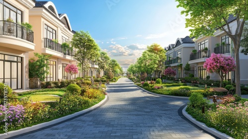 estate, garden, luxury, residential, architecture, house, street, greenery, tree, sky, cloud, landscape, design, exterior, modern, property, real, view, paseo, driveway, subdivision, development, home, plant, nature, daylight, sunny, brick, pavement, path, blooming, flower, villa, elegant, charme, refined, lifestyle, wealth, urban, quiet, peaceful, beautiful, environment, contemporary