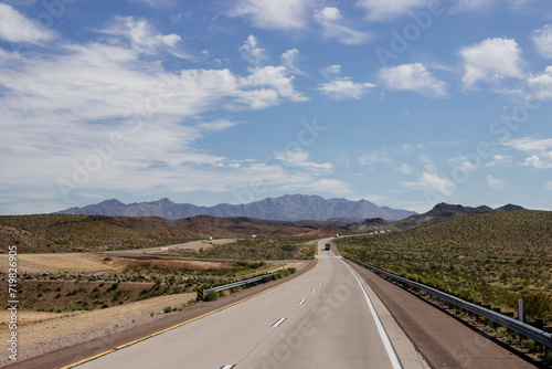 Scenic highway 40 near Phoenix in Arizona, USA. Beautiful road landscape on a sunny summer day. Nature in desert with mountain, blue sky and white clouds.