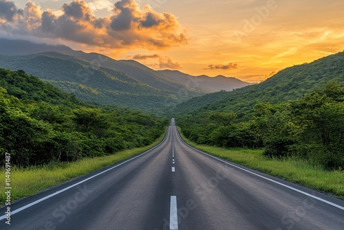 road, highway, asphalt, sunset, gold, sky, cloud, mountain, mountain, vale, green, tree, forest, nature, landscape, scenery, rural, travel, journey, drive, destination, horizon, scenic, beautiful, summer, light, evening, dusk, peaceful, tranquil, serenity, freedom, perspective, hope, adventure, exploration, open, endless, path, way, direction, curve, straight, long, distance