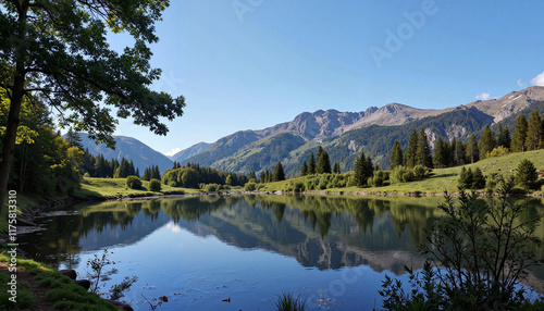 Scenic lake reflecting mountains and trees in a sunny landscape