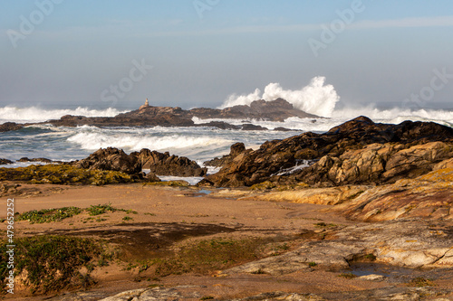 Scenic landscape of the Atlantic Ocean coast with beating waves against old brown stones with an old lighthouse and high splashes of blue water with white foam and clear sky, Portugal