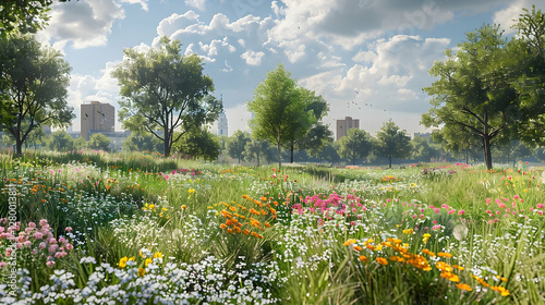 Scenic Meadow in Urban Park with Blooming Wildflowers and City Skyline