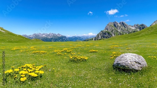 mountain, landscape, flower, yellow, green, spring, nature, meadow, rock, clear, sky, calmness, vibrant, beautiful, serene, sunny, hill, vale, blue, picturesque, scenic, environment, bloom, grass, plant, peaceful, bright, cloud, horizon, peak, sunlight, flora, springtime, adventure, travel, cheerful, growth, rustic, earth, natural, daylight, freshness, viewpoint, atmosphere, pleasant