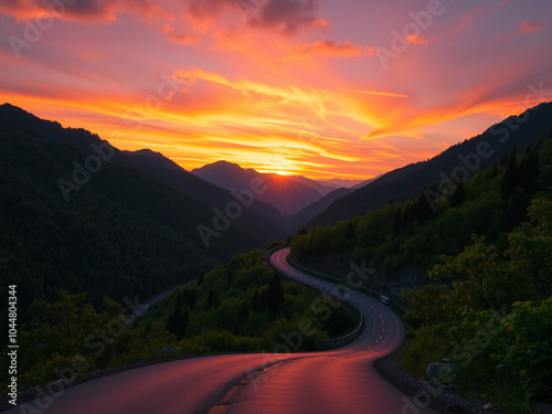 highway, sunset, nature, road, mountain, travel, sky, journey, hill, summer, curve, tree, transportation, sunlight, asphalt, forest, mountain road, freedom, horizontal, scenery, beauty, vacation, winding road, countryside, photo, color image, scenic, adventure, autumn, environment, landscape, horizon, no people, wilderness, car, cloud, rural scene, sunny, beautiful, majestic, serene, speed, sunrise, social issue