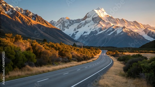 Scenic mountain road winding through autumn landscape towards majestic snow-capped peaks