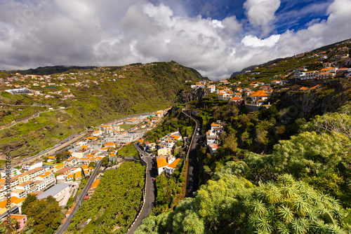 Scenic Mountain Valley with Rural Village and Lush Green Hills, Madeira landscapes, nature background or travel wallpaper