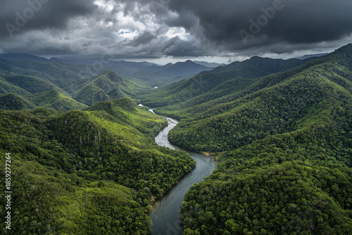 Scenic rainforest hills with river winding through dense green forest under dramatic cloudy sky creating moody and breathtaking natural landscape view
