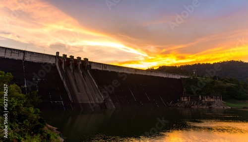 dam, reservoir, sunset, lake, water, energy, power, hydro, landscape, scenery, construction, engineering, concrete, structure, architecture, mountain, hill, picturesque, rural, tour tourism, travel, natural, outdoors, vibrant, scenic, tranquil, peaceful, evening, sunlight, resource, facility, conservation, irrigation, supply, utility, infrastructure, environment, ecological, sustainability, technology, innovation, development, control, management