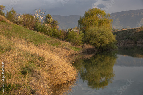 water, landscape, lake, nature, river, sky, autumn, tree, mountain, forest, grass, tree, duck pond, mountain, fall, green, outdoors, summer, beauty, rural, cloud, season, park, spring, calm, environment, tranquil, peaceful, river bank, scenic, travel, natural, daylight, wilderness, hill, meadow, sunlight, vegetation, countryside, blue, horizon, freshness, eco