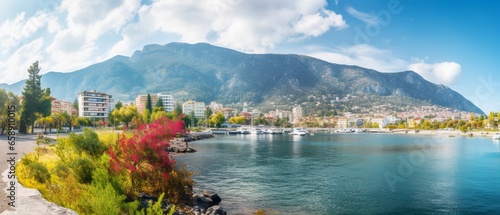 Scenic River Embankment and Park Area with Majestic Mountain Backdrop in Alanya, Turkey: Colorful Panoramic Landscape
