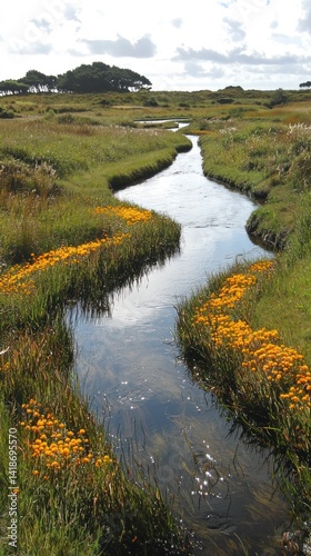 river, meadow, flower, landscape, nature, water, stream, grassy, vegetation, wetland, flowing, flora, serene, rural, tranquil, natural, environment, summer, countryside, bank, shoreline, sunny, day, sky, plant, scenic, beauty, peaceful, fresh, idylli, pathway, meandering, clear, current, ecosystem, foliage, grass, picturesque, springtime, summer