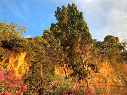 rock, forest, timberland, garden, tree, cypress, cliff, oleander, flower, sky, pine, mediterranean, flowering, green, pink, landscape, mountain, summer, foliage, beautiful, colourful, nature, park