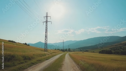 road, field, mountain, sky, powerline, nature, landscape, country, sunlight, summer, countryside, horizon, electricity, peaceful, green, nature trail, travel, environment, clear, serene, grass, path, blue, scenery, hill, rural, sunny, calmness, expansive, electric, panoramic, daylight, scenic route, energy, picturesque, scenic view, open space, bright, natural light, dirt road, adventure, calm, remote