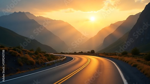 Scenic sunset road trip through majestic mountains golden hour light winding asphalt path