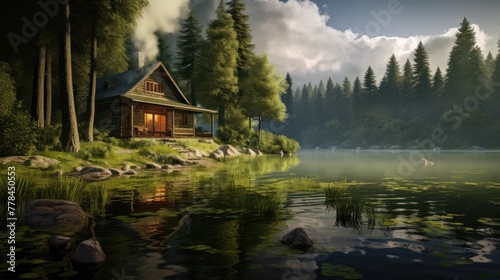 Scenic vacation spot: a cozy house by the water, surrounded by the tranquility of a lush green forest.