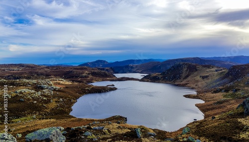 Scenic View of a Serene Lake Surrounded by Rugged Mountain Landscape under a Cloudy Sky