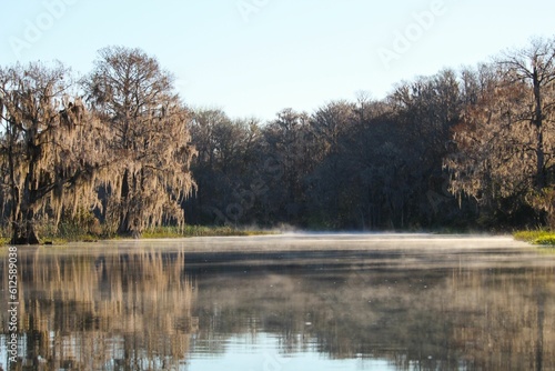 Scenic view of an autumn trees reflecting on the calm lake in sunlight