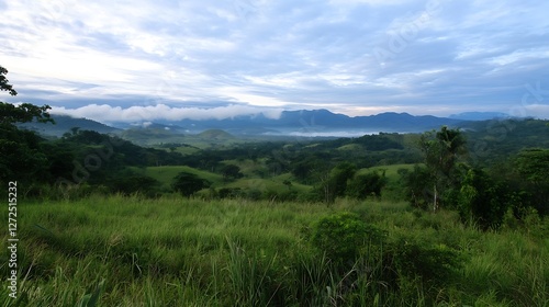 Scenic view of green hills and mountains under a cloudy sky in a tranquil natural landscape : Generative AI
