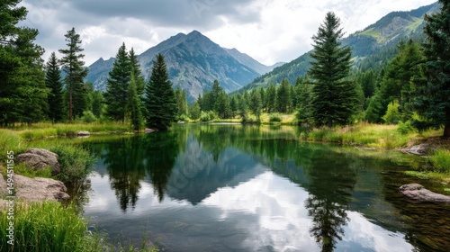 Scenic view of lake in pine forest near beautiful mountain concept. Serene mountain landscape with a peaceful lake and lush greenery.