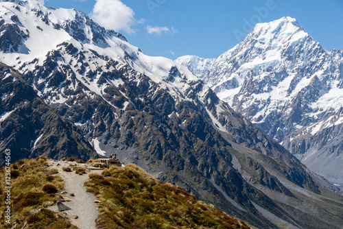 Scenic view of Mount Cook and surrounding peaks from Sealy Tarns, New Zealand