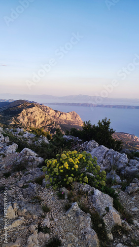 sunset, mountain, coastline, wildflower, landscape, nature, serenity, evening light, flora, hiking, scenery, wilderness, adventure, travel, exploration, coast, ocean, waterfront, beauty, calm, sky, horizon, green plant, tranquil, summer, relax, peaceful, remote, quiet, vibrant, colourful, scenic view, geology, travel destination, natural beauty, panoramic view, sunlight